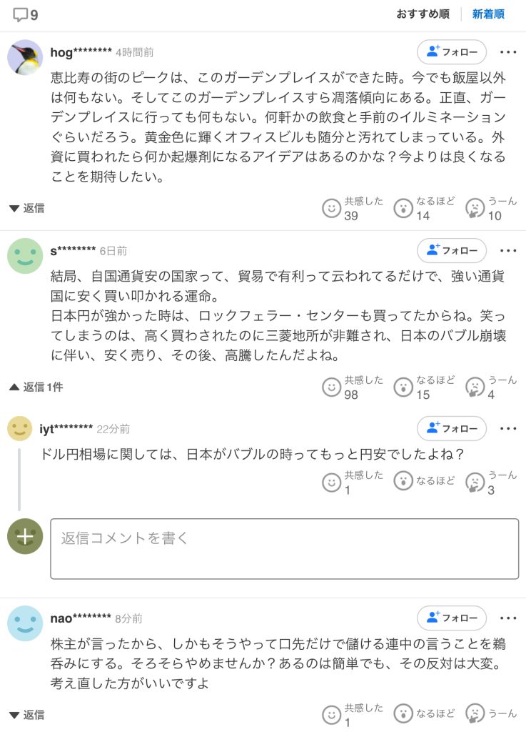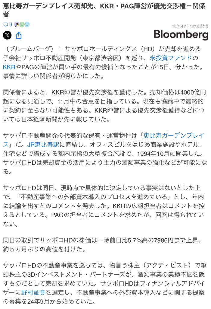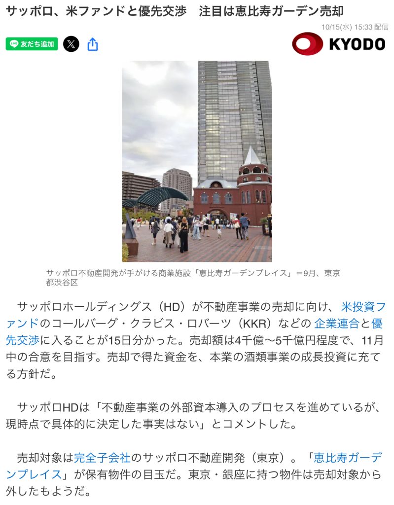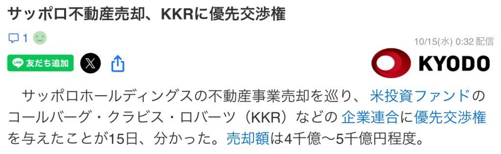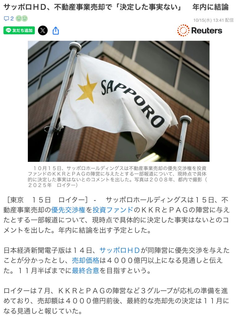 サッポロも株主から色々言われてるだろうし、円安が進む限り、外国人に日本の土地建物が買われてゆくのが加速しそう。