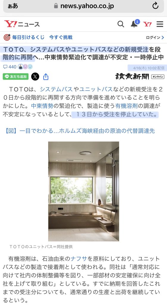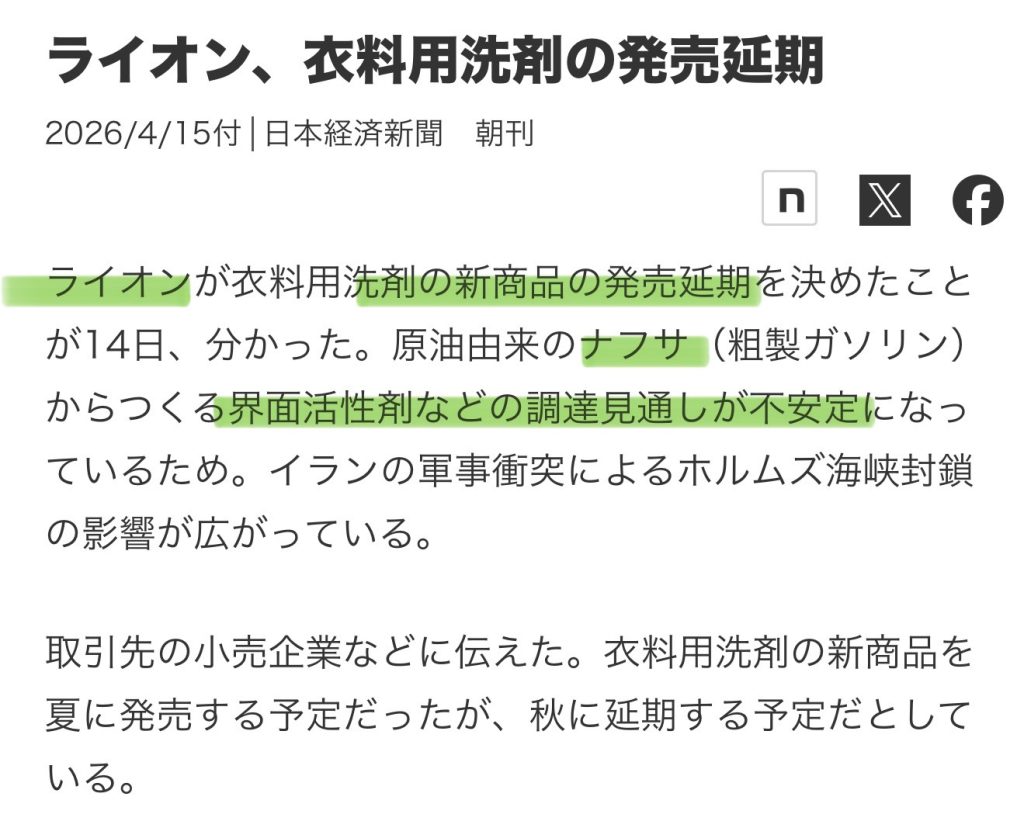 ライオンは、新商品発売を延期しました。 ナフサが少ない日本は、 LPGと物々交換もアリなのでは? おっと、TOTO 復活早い。 3日の間に何があったんだろ? 何かの圧力でなければ良いんですが… 随時追記します。
