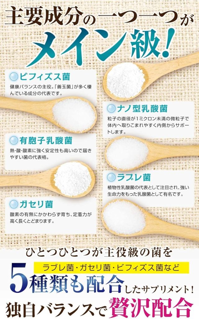 - 菌トレ習慣サプリは一袋にビフィズス菌、乳酸菌、ラブレ菌、ガセリ菌を配合!
